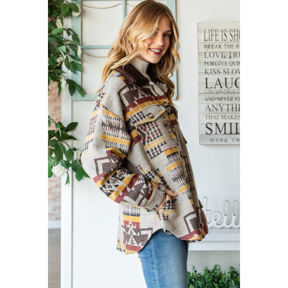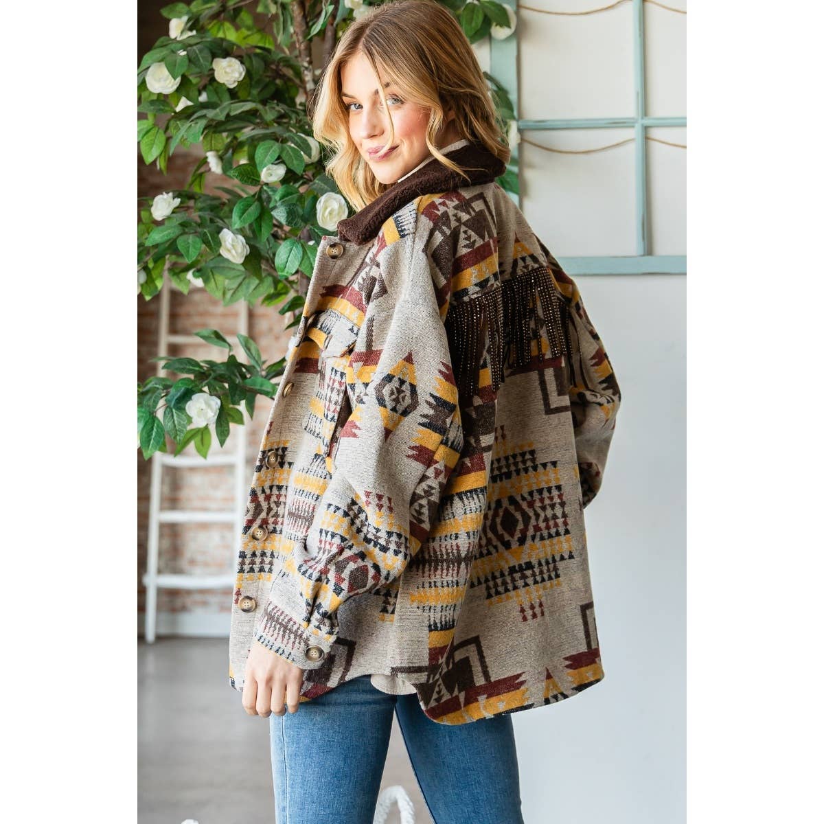 -Vintage pattern thick knit -Silver trim solid fringe on back -Solid sherpha neck -Button closure -Curved hem Handwash Cold 100% Polyester Model is 5'8" and wearing size Small
